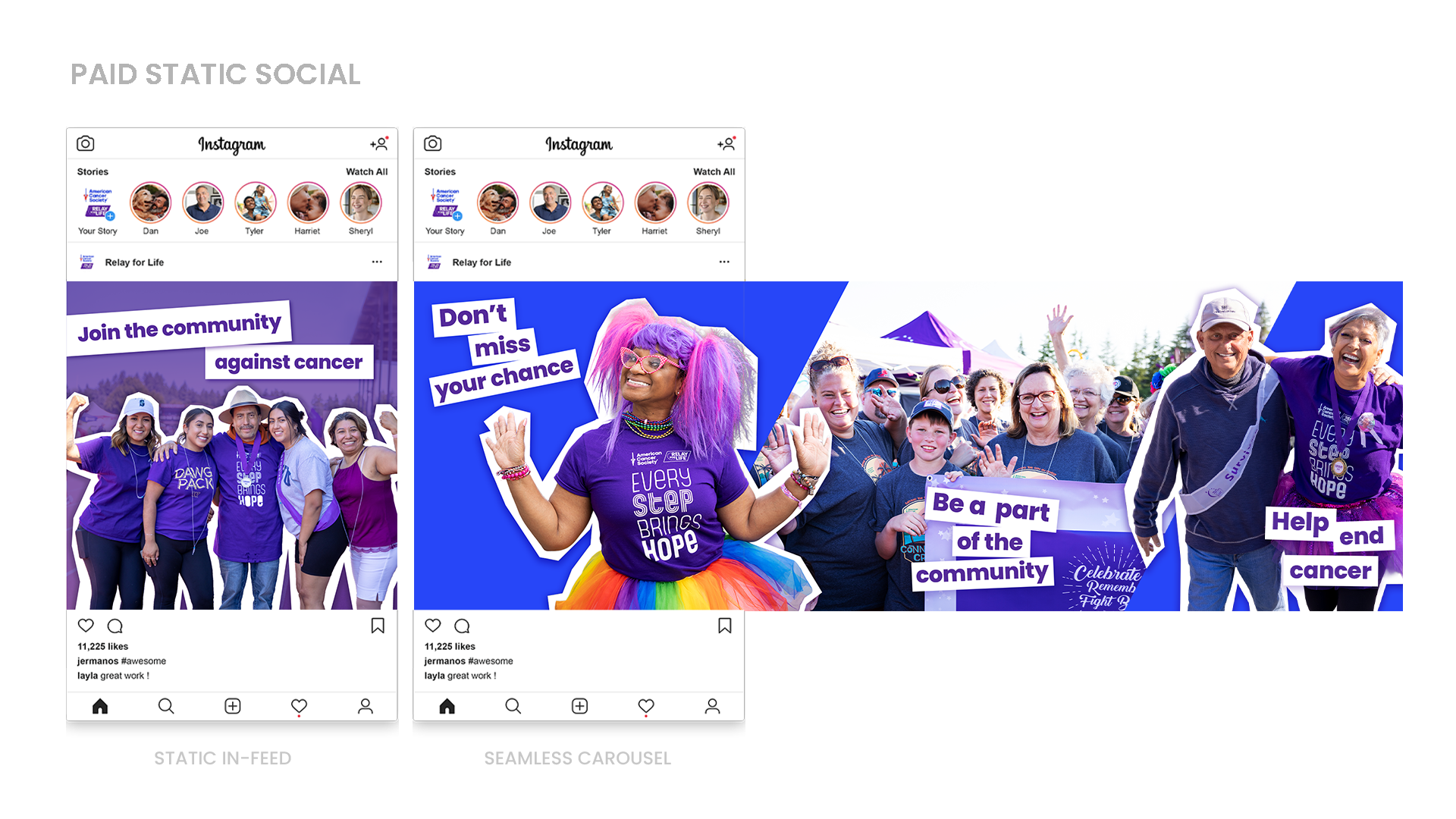 I took ownership of concepting and designing a wide range of deliverables, including static and video formats, as well as animating assets for our Giphy suite. The idea behind this creative was to create a suite of assets that championed the on the ground - grassroots aspects of our community fundraising event, Relay For Life. We employed a scrapbook feel to the creative which popped on people's feeds and broke away from our usual branded creative. I worked closely with an art director to ensure the campaign was designed to achieve strong results. Several top-performing assets led to over 5k in registrations just in the first month alone.